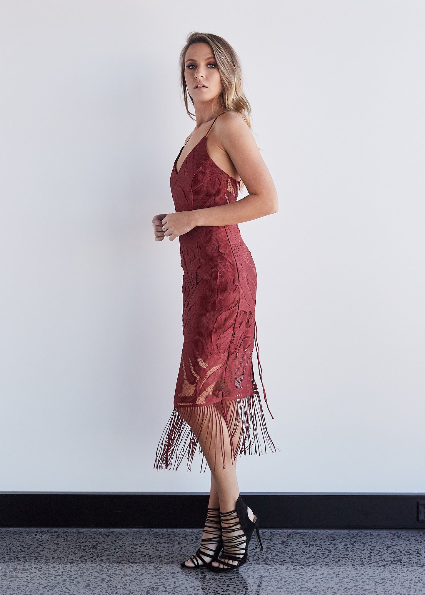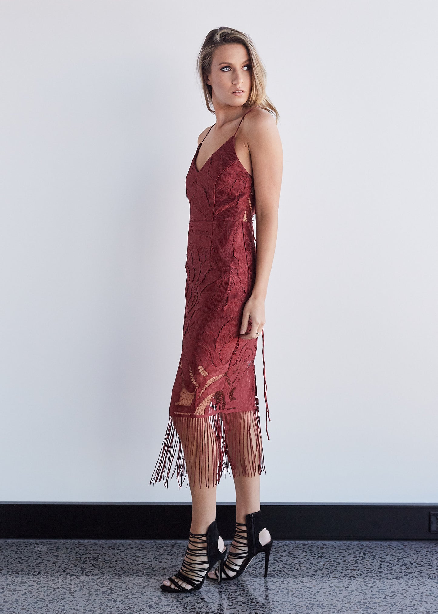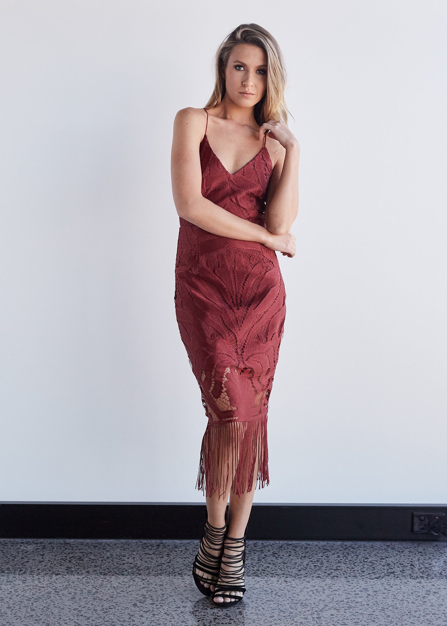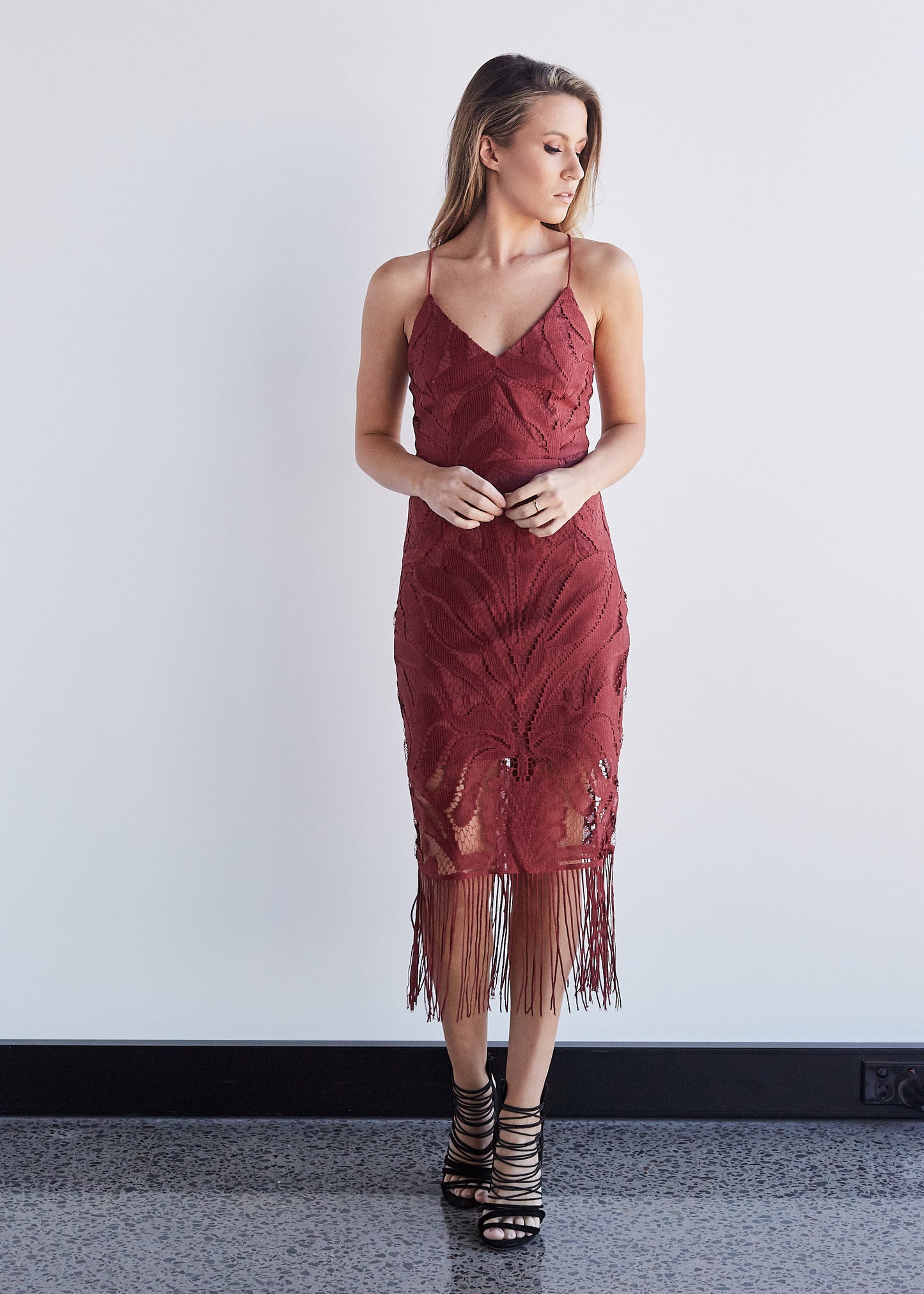 Beautiful full lace dress with a fringe hem and lace up back.