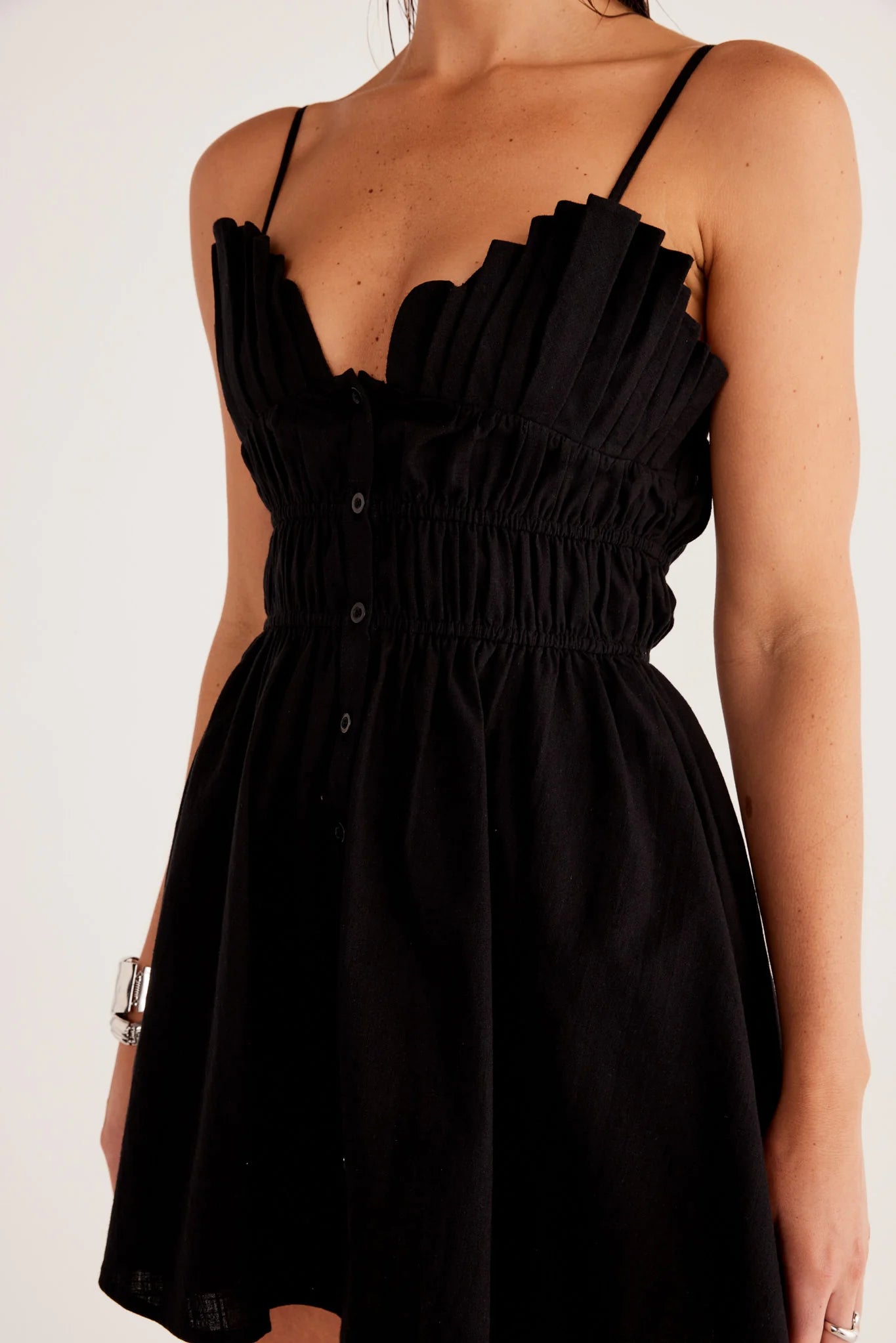The Mahalia mini dress has a pleated bust detail with adjustable tie up straps. Double elasticated waistline with button down front closure